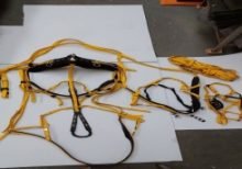 Arreio Charrete Fita, disponível nas cores: amarelo, azul, preto/vermelho. Acompanha: tapa-cara, peitoral, tirante, rédea. Ferragens de metal. |