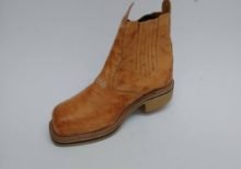 Botina Wrangler em couro modelo “escamada”, cor palha, colada e costurada, solado látex. |